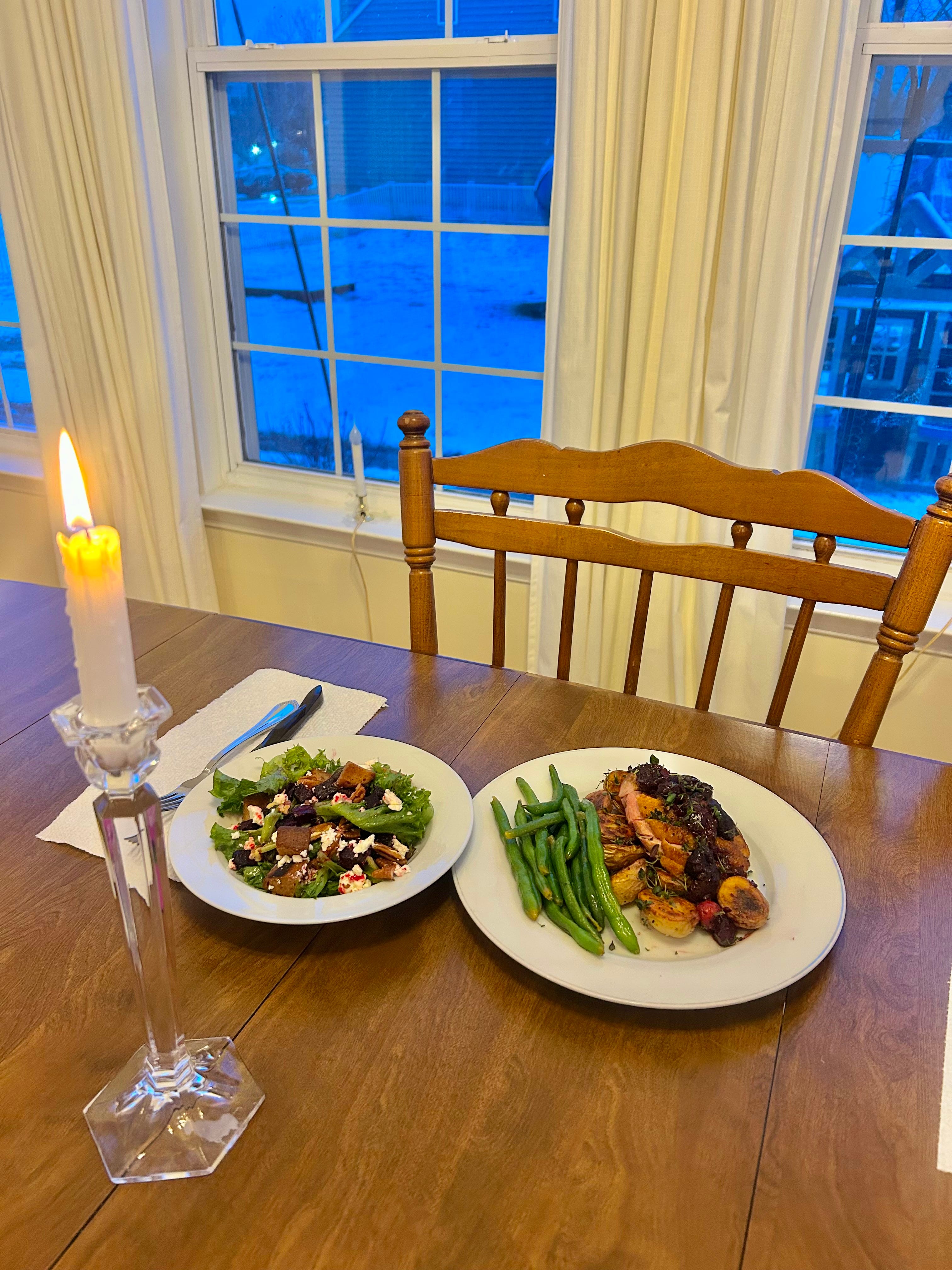 Salad with gingerbread croutons, pecans, roasted beets, and goat cheese.